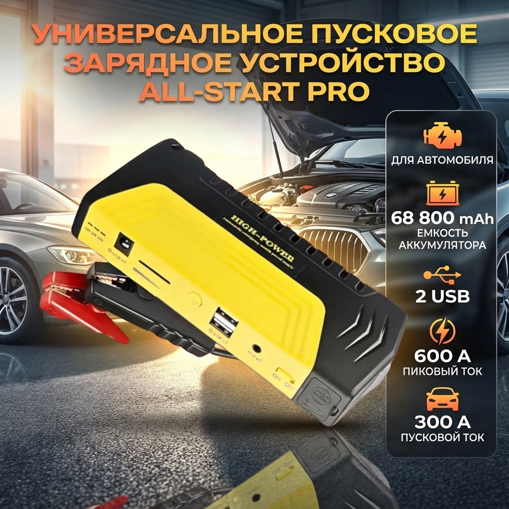 Утро. Мороз. Вы опаздываете, а автомобиль не заводится — аккумулятор сел. Знакомая ситуация? Теперь не нужно искать «прикуриватель», ждать такси или службу эвакуации. ALL-START PRO дарит вам полную автономию и уверенность. Это ваш личный источник энергии, который всегда под рукой.
