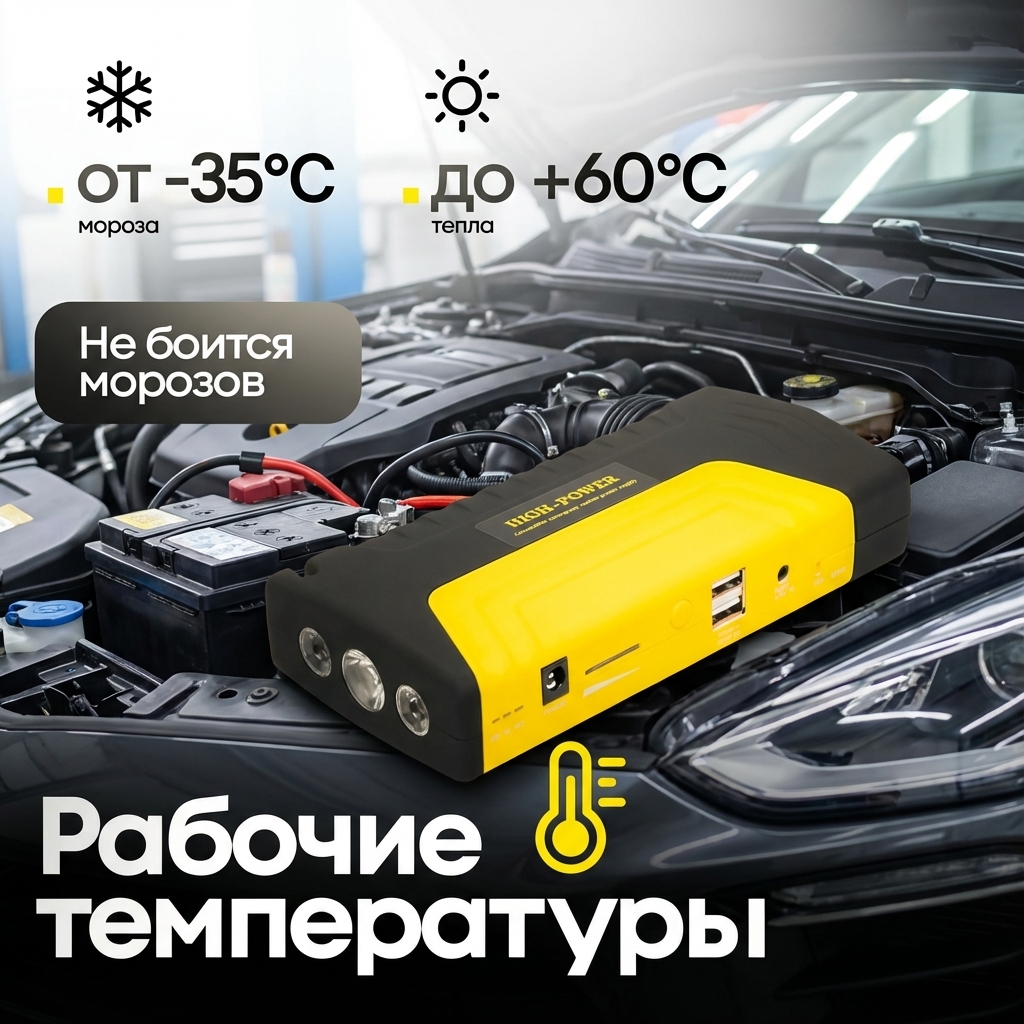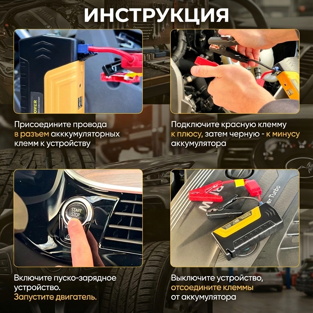 ● Умный автозапуск: Просто подключите клеммы — устройство само определит полярность и пустит ток для запуска. Безопасно и просто.